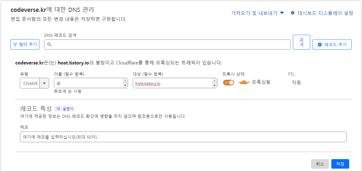 이제 클라우드플레어에서 오리진 도메인에 대한 CNAME 설정이 완료되었습니다. 클라우드플레어를 통해 해당 도메인으로 들어오는 요청은 오리진 도메인으로 전달되어 처리됩니다.